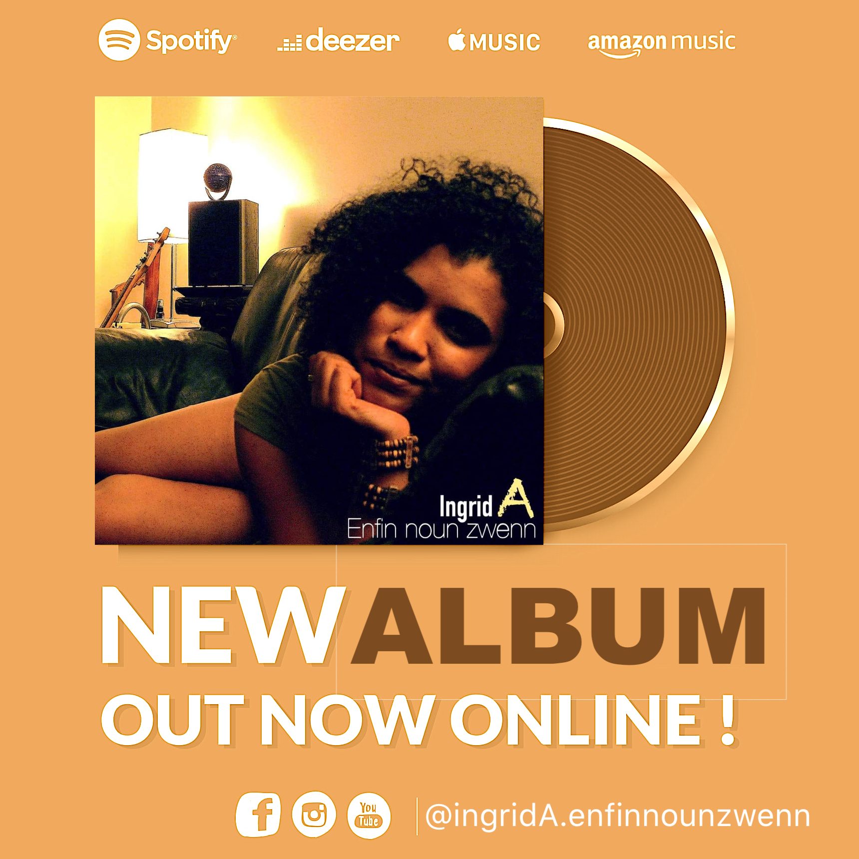 Her local collaborations multiplied and continued until 2017, when becoming lead singer of the "Groove Avenue" orchestra conducted by Stephan Gebert, she devoted herself entirely to this adventure which scoured the hotels, private parties and clubs of the city. island until 2020. In 2020, when the world of culture is brutally paralyzed by the Covid-19 health crisis, finally releases a first album under the name of Ingrid A. A project that thinks outside the box. a music mixed between Jazz, Electro, Hip Hop, World Music, Pop, Acoustic and French Chanson. This album is an open window on the world, a travel diary made of encounters and sharing in collaboration with producer Chris Arles. These are then nine titles, a range as representative as possible of his multiple influences and musical experiences over the past 20 years, which finally see the light of day. And with them the synthesis of this rich journey full of twists and turns. It became necessary to assume all this, with no distinction, between Creole culture and her love of Soul and French repertoire.