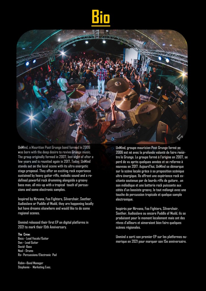 UnMind, a Mauritian Post Grunge band formed in 2006 was born with the deep desire to revive Grunge music. The group originally formed in 2007, lost sight of after a few years and is reunited again in 2017. Today, UnMind stands out on the local scene with its ultra energetic stage proposal.